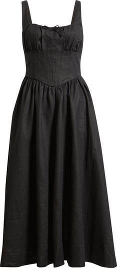 A corset-style bodice and dainty tie at the gathered neckline add classical charm to a twirl-worthy sundress made from summertime-essential linen.