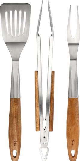 Upgrade your grilling game with the Oster Balincourt 3-Piece Stainless Steel and Wood BBQ Tool Set, the perfect addition to any barbecue enthusiast's toolkit. This premium set includes one pair of tongs, one spatula, and one meat fork, all designed with durability and ease of use in mind. The stainless steel heads are heat-resistant and built to withstand the rigors of high-temperature grilling, while the Acacia wood handles offer a sturdy and comfortable grip for better control. The rich brown color of the wood adds a touch of rustic elegance, making this set as stylish as it is practical.Designed for safety and convenience, the extra-long handles provide a safe distance from the grill's heat, while the hanging holes make storage a breeze. Whether you're flipping burgers, turning steaks, or lifting delicate seafood, this BBQ tool set is engineered for superior performance. To preserve the beauty of the Acacia wood handles, simply hand wash and occasionally apply oil to maintain their natural finish. Ideal for summer cookouts, backyard barbecues, or as a thoughtful gift, the Oster Balincourt BBQ Tool Set combines functionality and style for the ultimate grilling experience.
