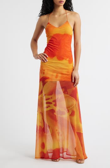 Turn up the heat in this sultry mesh maxi dress splashed in a vibrant abstract print that commands attention. A V-neck and delicate halter straps tie at the neck with hardware-bead finishes, while a mid-thigh lining offers coverage beneath the sheer, sweeping silhouette.
