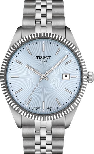 A luxe Swiss-made watch radiates poise and elegance with an etched guilloché dial, fluted bezel and classic brushed-steel bracelet.