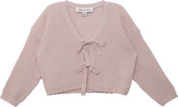 Add a touch of elegance to her wardrobe with this light pink Ballerina Sweater. Made with a cozy waffle-knit texture, it features a delicate V-neckline, charming bow ties, and a scalloped hem. Ribbed cuffs provide a snug fit, making it perfect for layering or wearing solo on breezy days. A versatile pick for stylish comfort!