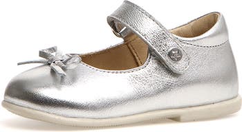 Make your aspiring ballerina's outfits come true with this metallic mary jane flat adorned with a dainty bow and a hook-and-loop closure for an adjustable fit.
