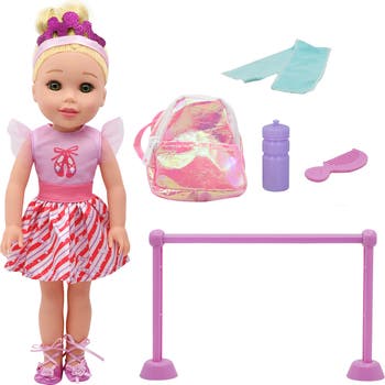 STYLE DREAMERS: BALLET SET - 14" DOLL - The Style Dreamers 14" Ballet Set is a dream come true for young dance enthusiasts who love to twirl and leap alongside a charming new friend! This enchanting playset is perfect for little ones who adore ballet and imaginative play, offering everything needed for a day full of dance and fun. At the center of this delightful set is a beautifully crafted 14" baby doll, designed with a durable plastic body and poseable arms and legs. This flexibility allows the doll to mimic various ballet poses, making it an ideal companion for aspiring dancers. The doll features elegant blond hair styled into a classic ballet bun, accented by a stylish purple crown headband that adds a touch of flair. Her sparkling blue eyes and cute smile bring her to life. The doll is dressed in an adorable ballet outfit that includes a fitted leotard and a tutu, perfectly complemented by matching ballet slippers. This outfit not only looks authentic but is also designed to inspire creative play, whether your child is practicing their own dance routines or putting on a performance for an audience of stuffed animals. To enhance the dance experience, the set includes a variety of essential ballet accessories. There’s a sturdy dance bar, perfect for practicing pirouettes and pliés. The set also comes with a stylish backpack to carry all the dance essentials, a water bottle to stay hydrated, a comb to keep the doll’s hair neatly styled, and a towel for those well-deserved breaks. With the Style Dreamers 14" Ballet Set, your child will have everything they need to step into the spotlight and dance the day away.