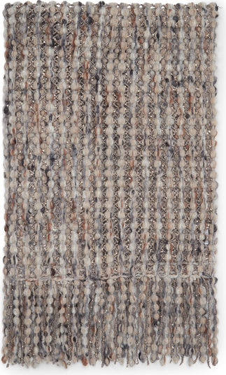 The garment uses luxurious virgin wool, cashmere and mohair fibers to create small spheres with a light, soft texture, joined by a fine netting, delicately crafted with a yarn of sequins, adding a discreet sparkle and refined elegance.
