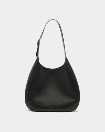 The essential lines of the Althea hobo bag are constructed in black leather with a natural grain finish. The shoulder strap is adjusted via a gold-tone metal buckle.