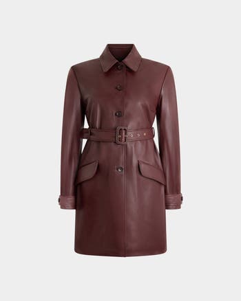 In a deep Burgundy hue, this coat is constructed from soft nappa-tanned lambskin and finished with two flap pockets, horn-effect resin buttons and a self-belt with a rectangular leather-covered buckle.