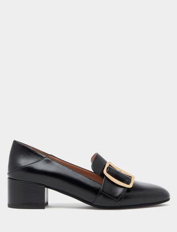 This Bally Boucle pump in leather is characterized by the large buckle at the front, a reinterpretation of an iconic Bally detail from the 1920s. To the back, the heel folds down for use as a mule.