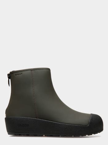 Inspired by an archival design for the Swiss Olympic team, this Curling bootie in military green rubberized leather is engineered for insulation, comfort and maximum stability. A practical zipper fastens the back.