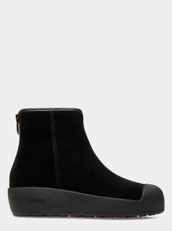 Inspired by a 1950s design by Bally for the Swiss Olympic team, this Curling bootie in black suede is engineered to insulate and cushion while providing maximum stability via the Vibram Arctic grip sole. A practical zipper fastens the back.