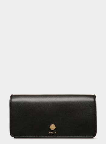 The Bally Essential phone wallet is made from fine black calfskin and finished with gold-tone Bally Crest hardware on the flap closure. A leather strap ensures easy carry.