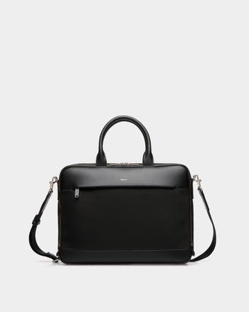 The Vogel Briefcase in black nylon and recycled leather is designed for seamless organization. Its double compartment features a laptop holder and multiple pockets. Top handles, an adjustable shoulder strap and a luggage sleeve ensure on-the-go practicality.