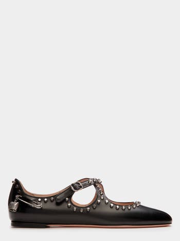 Bring a touch of chic attitude to your wardrobe with this Mary-Jane-inspired Ballyrina flat, here in fine black calfskin. Cool silver-tone metal details fuse with Bally heritage, expressed through impeccable craftsmanship.
