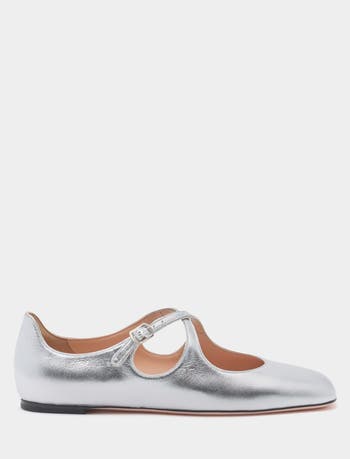 This Ballyrina flat is meticulously crafted in soft sheepskin with a silver finish. Two slender straps cross at the top, secured by a metal buckle inspired by a detail from the Bally archives. A square toe provides an on-point finish.