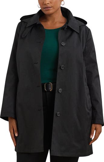 Gleaming buttons punctuate a weather-ready raincoat fixed with a back vent for easeful movement.