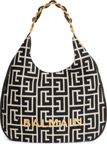 Founder Pierre Balmain's fascination with France's labyrinthine gardens manifests in a maze-like pattern on this slouchy hobo with a gilded, leather-wrapped chain. Olivier Rousteing's 1945 collection pays homage to some of the French fashion house's boldest midcentury designs.
