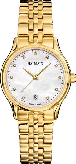Eleven glittering diamonds multiply the shine of a gleaming bracelet watch boasting a lustrous mother-of-pearl dial and a date window at the six o'clock hour.