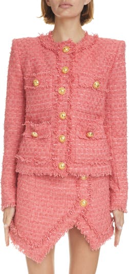 Raw edges and polished buttons detail this basket-weave tweed jacket tailored with strong shoulders and dyed a standout hue.