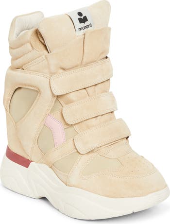 A chunky sole with logo tread and hidden wedge heel add commanding height to this basketball-inspired high-top boasting a distinctive layered design.