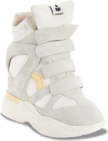 A chunky sole with logo tread and hidden wedge heel add commanding height to this basketball-inspired high-top boasting a distinctive layered design.