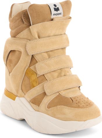 A chunky sole with logo tread and a hidden wedge heel add commanding height to this basketball-inspired high-top featuring a distinctive layered design.