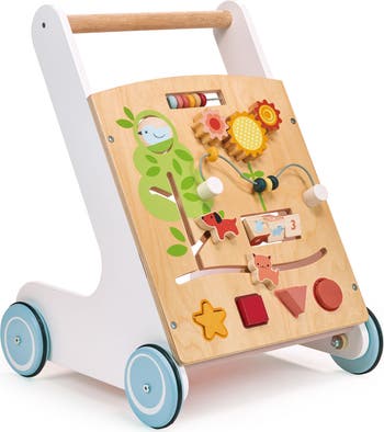 This 4-wheeled toddler activity walker has a plywood front panel with a spinning disk, 3 cogs, 2 sets of beads on a wire, 3 spinning cubes, 4 shape sorting pieces, a moving kitten and puppy. It also has a fabric tray to hold toys.