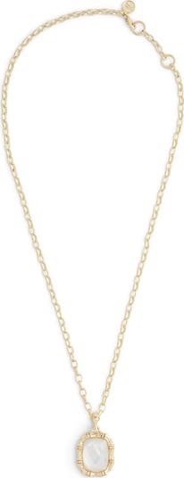 A faceted mother-of-pearl pendant framed by a bamboo-textured border finely detailed with glittering crystals brings a vintage vibe to this necklace plated in 18-karat yellow gold.