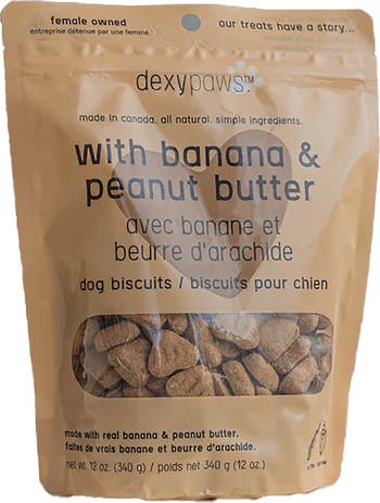 DEXYPAWS: BANANA OAT & PEANUT BUTTER DOG BISCUITS - 12oz Bag - Introducing our treat series. All of our treats are soy- and corn-free and made in Canada with simple, real, and highly palatable food. These treats are perfect to use as a reward during training sessions or whenever you feel like spoiling your pup! They come in a convenient resealable 12oz bag so that your treats stay fresher and crunchier for longer. Gentle on Sensitive Stomachs: With gentle, easily digestible ingredients, these treats are ideal for dogs with sensitive stomachs or dietary sensitivities, providing a soothing and safe option for your pet. INGREDIENT BENEFITS: Bananas are high in potassium which aid in muscle function. Packed with fiber to enhance digestion and maintain regular bowel movements. Contains natural sugars that provide a healthy energy lift. Flavorful and palatable ingredients. INGREDIENTS: Barley, Banana, Cane Molasses, Oats, Peanut Butter, Sunflower Oil, Rosemary Extract, Sunflower Lecithin. MADE IN CANADA: Proudly produced in Canada with high-quality ingredients, ensuring you’re giving your dog the best.