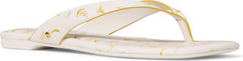A colorful banana print brings a dose of whimsy to a minimalist leather flip-flop perfect for your sunny-day looks.