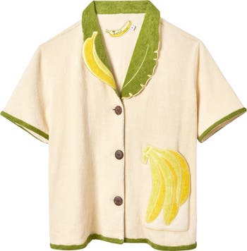 - A playful banana bunch, appliquéd and edge-embroidered, decorates the wearer’s left patch pocket, secured with a discreet hidden button.
