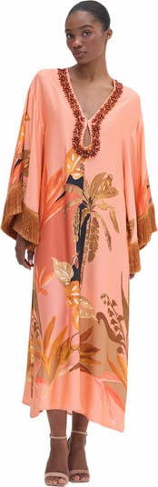 - This full length caftan features a plunging neckline with a keyhole detail and hand-beaded embroidery outline. Fringe detailing along the arms and hemline for a flowy loose fit. Made in China. 100% Viscose. Fringes 100% Polyester. SPL30962US