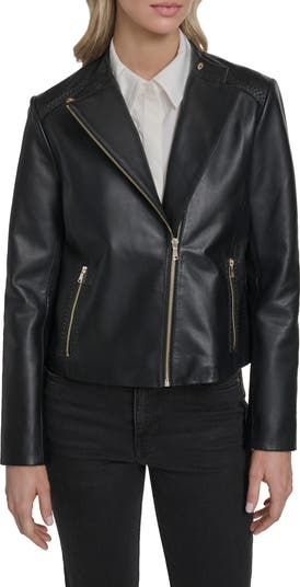 Bring a polished edge to your ensembles with this sharply crafted leather jacket detailed with hand-woven seams.