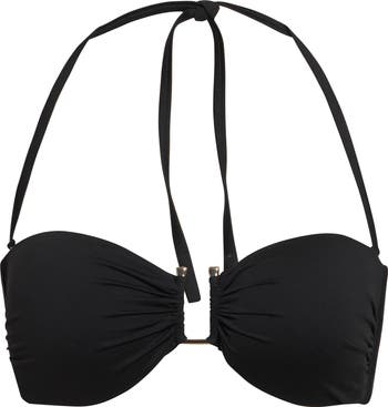 This sleek bandeau bikini top centered with a U-shaped bridge is designed with removable padding and optional wide-set halter straps for versatility in styling.