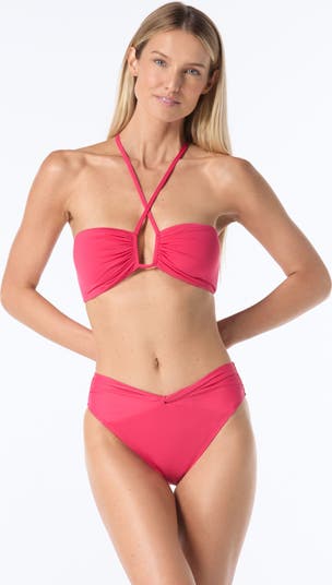 A bold bandeau swim top with a statement strappy neckline in tropical inspired solids. Gold hardware accents add a luxe touch to this bandeau bikini top. Mix and match with coordinating solids or printed bottoms.