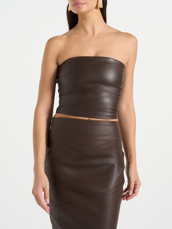 Expertly crafted from high-quality vegan leather, this black bandeau corset top features a panelled design and ruched back for a sleek look. Perfect for adding a touch of edge to any outfit, while also being environmentally friendly.