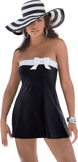 This elegant bandeau swimdress features a charming bow detail and removable, adjustable straps for versatile styling. With no-slip silicone at the neckline and sewn-in cups for support, it ensures a secure and flattering fit. The Power-mesh lining and princess seams offer sleek shaping, making it a chic choice for any swim day.