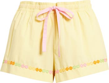 Colorful daisy-chain lace trim adds a cheerful touch to pajama shorts made from lightweight cotton poplin that will get softer with every wash.