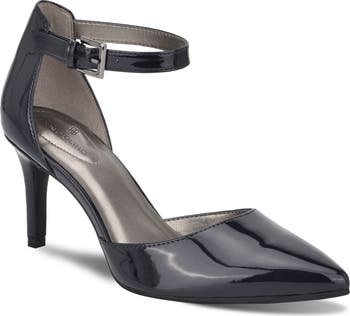 A pointy toe and slim ankle strap refine the look of this sleek and modern pump.