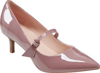 A knotted mary jane strap adds retro appeal to a striking pump framed by a pointy toe and tapered kitten heel.