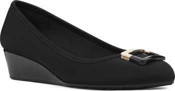 A buckle embellishment polishes the look of this wedge pump that's ready for the workday or special events.
