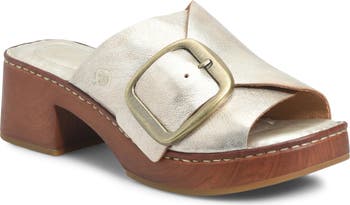 An aged-finished buckle intersects the wide straps on a cushioned slide sandal grounded by a woodgrain platform and modest block heel.