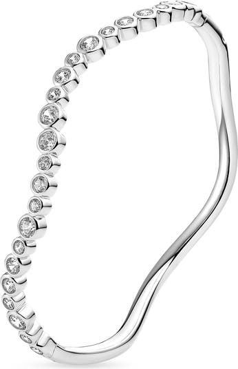 Bangle made of 18k gold plated 925 Sterling Silver (Gold variant), Rhodium 925 Sterling Silver (Silver variant), with a polished surface and handset with facet cut white zirconia.