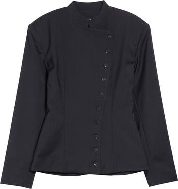 This sleek pinstripe jacket fashioned with an asymmetric button closure is crafted from the brand's signature stretch suiting fabric woven from mulesing-free wool and recycled polyester that resists wrinkles. The tailored fit contours the body, while an upright mandarin collar brings a polished look.