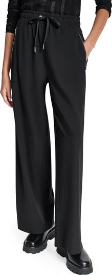 Exposed zippers bring utilitarian shine to the pockets of wide-leg, drawstring-waist pants that bridge the gap between comfort and style.