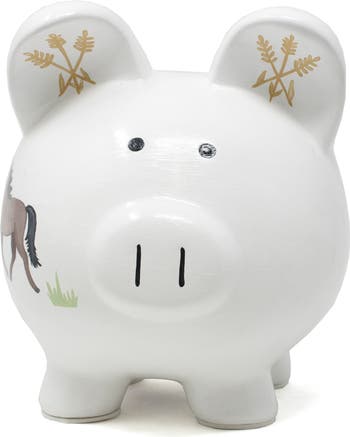 This little piggy bank is full of barnyard adventures with illustrations of a tractor, horse and other farm animals.