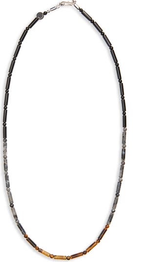 Polished bars alternate with black onyx, labradorite and golden tiger-eye beads on this elongated necklace strung in a striking pattern.