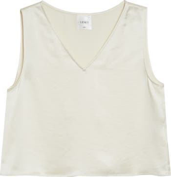 Layer from day to night in this glossy satin sleeveless top cut in a boxy cropped fit.