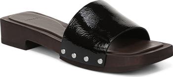 Brushed midsole studs add a hint of retro appeal to a square-toe slide sandal lifted by a slight platform and low block heel.