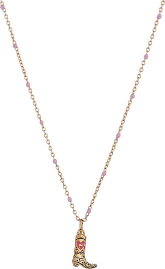 Western chic, but make it Barbie™. This gold-tone pendant necklace features a pink-detailed cowgirl boot charm, capturing that fearless, fun-loving spirit. Strung on an adjustable-length chain with soft pink beads, this piece is all about standing tall, shining bright, and kicking up some dust—Barbie™ style.
