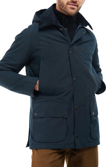 A rugged corduroy collar elevates a hearty parka with a diamond-quilted lining and a polyurethane membrane for all-weather comfort.
