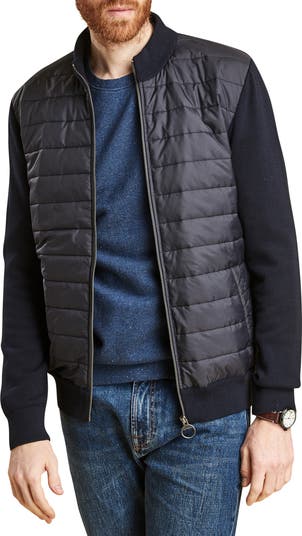 A baffle-quilted nylon front warms a soft cotton-knit jacket topped with a stand collar for added comfort.